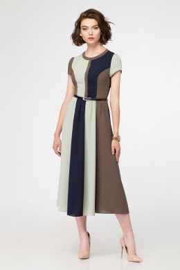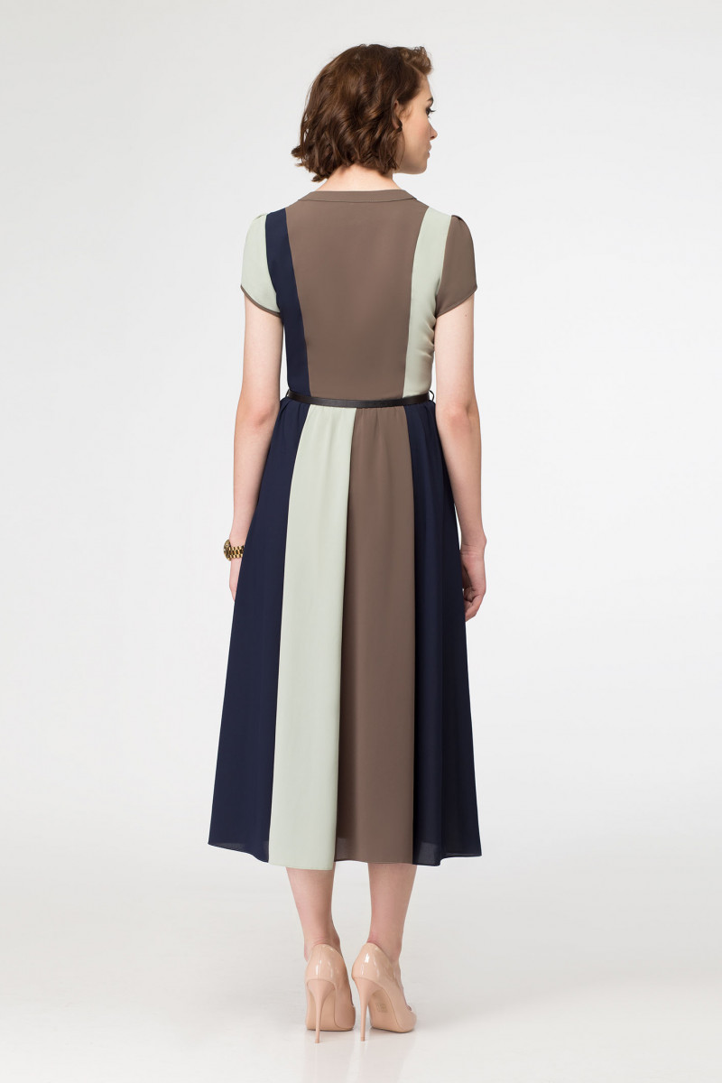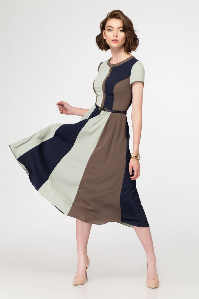 Эффектное нарядное платье, которое построено на сочетании гармоничных цветов, создавая лёгкий нарядный образ. Платье отрезное по талии. Верхняя часть платья с застежкой на планку и с рельфными швами. Юбка расклешенная, длиной ниже коленей. Рукава короткие, по окату складка. Платье дополнено съёмным поясом, который подчеркивает талию.