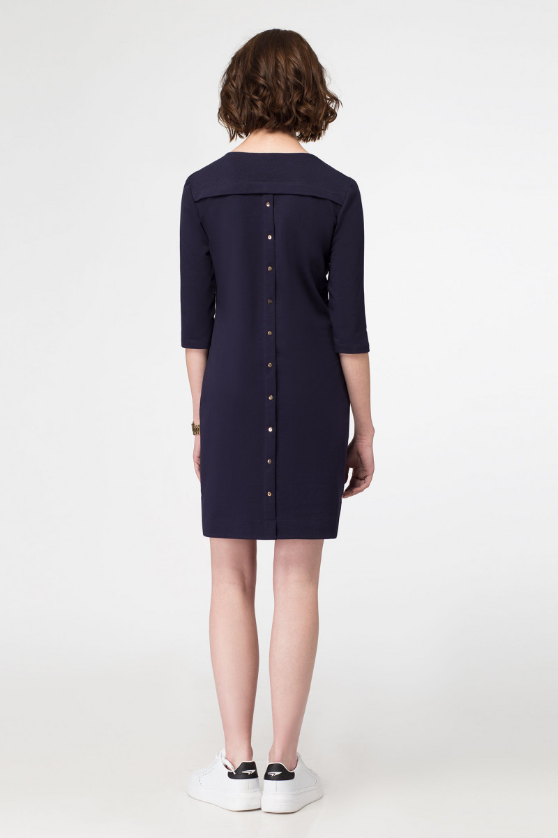 Лаконичное молодежное платье с оригинальной вышивкой на левой стороне платья и на кармане. Платье выполнено из трикотажного полотна. Платье полуприлегающего силуэта, с круглым вырезом горловины, с рукавами длиной три четверти, с карманами в боковых швах. Спинка с кокеткой и декоративной планкой с яркими пуговицами. Низ фигурный.