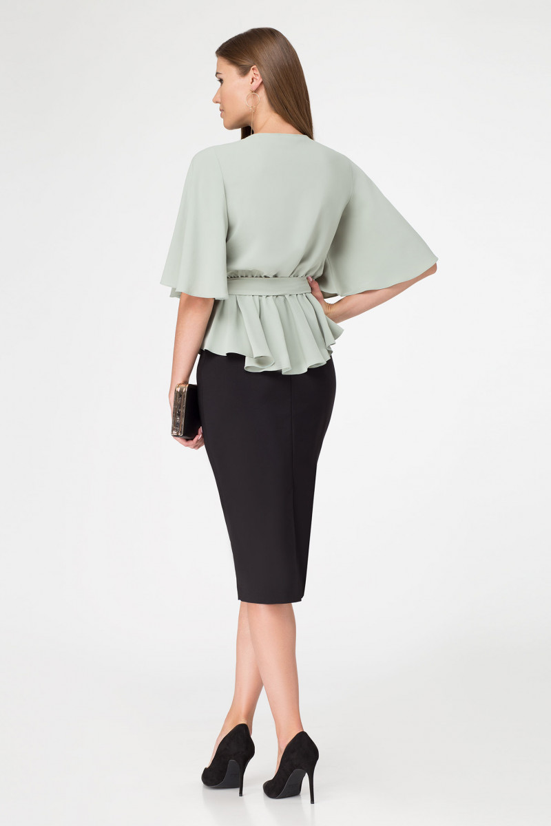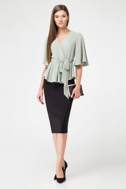 Легкая струящиеся блузка из шифоновой ткани. Блузка отрезная по талии на резинки, нижняя часть разведенная, по талии съёмный пояс, который завязывается в бант, дополняя модель. Блузка с глубоким V - образным вырезом горловины, с эффектными широкими рукавами. Такая блузка отлично сочетается как с классическими брюками, так и с классической юбкой, создавая нарядный женственный образ.