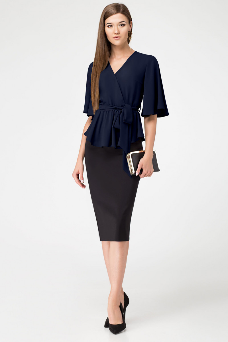 Легкая струящиеся блузка из шифоновой ткани. Блузка отрезная по талии на резинки, нижняя часть разведенная, по талии съёмный пояс, который завязывается в бант, дополняя модель. Блузка с глубоким V - образным вырезом горловины, с эффектными широкими рукавами. Такая блузка отлично сочетается как с классическими брюками, так и с классической юбкой, создавая нарядный женственный образ.