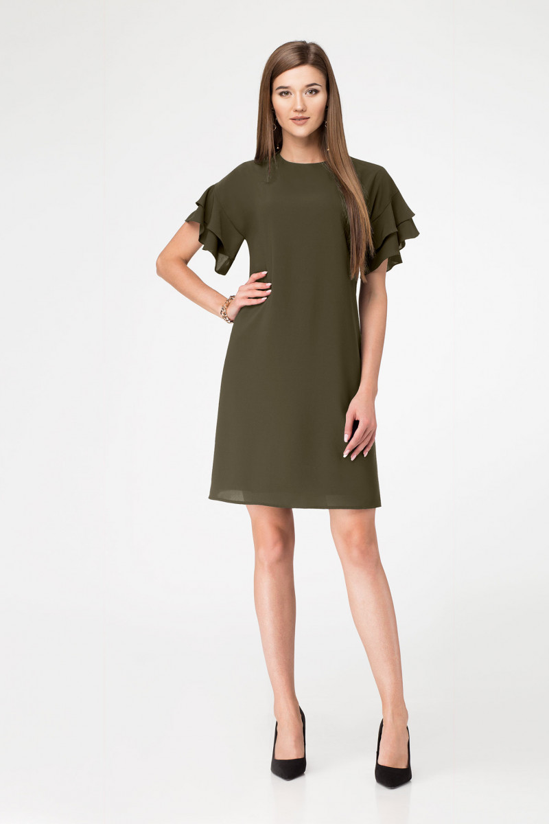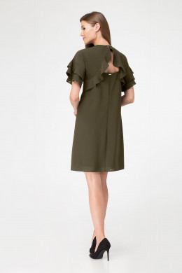 Нарядное платье из шифоновой ткани. Платье прямого силуэта, длиной до коленей, с короткими рукавами, с застежкой на навесную петлю и пуговицу по спинки. По спинки декоративный вырез, который дополнен рюшами. Рукава короткие состоящие из двух слоев рюш.