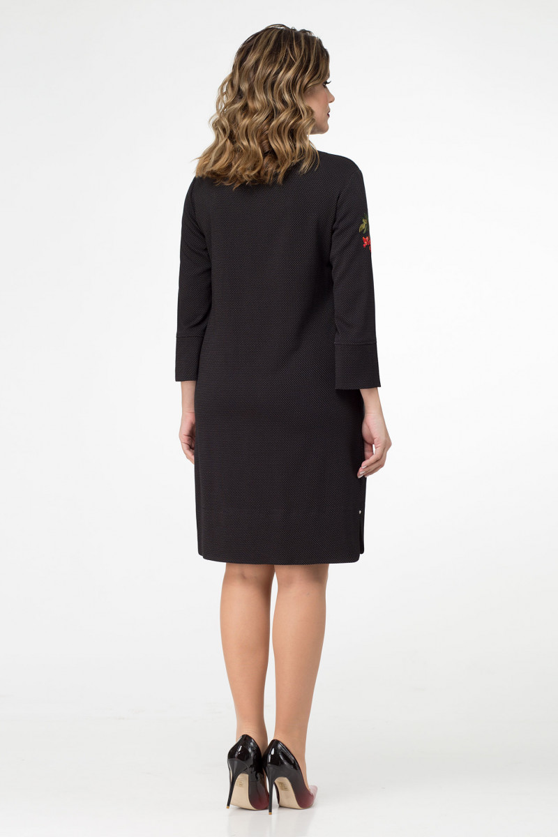 Платье прямого силуэта, воротник отложной, с центральной застежкой на пуговицы, в боковых швах обработаны боковые карманы, низ платья с закругленными разрезами.