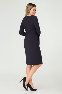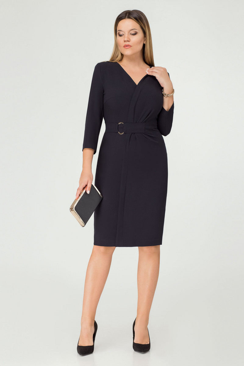 Платье прилегающего силуэта. С имитацией запаха. Горловина V- образной формы. Рукав 3/ 4. Спереди по линии талии пояс с декоративным кольцом.