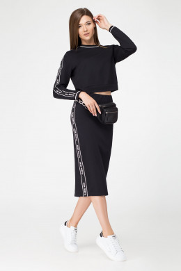Женский костюм из трикотажного полотна состоит из укороченного джемпера и юбки. Джемпер свободный, с длинными рукавами, с круглым вырезом горловины, на притачной широкой манжете по низу. По рукавам и по плечу настрочена декоративная тесьма. Юбка плотнооблегающая, длиной ниже коленей, с карманами в боковых швах. По бокам юбка дополнена декоративной тесьмой.