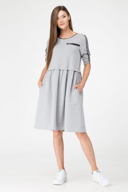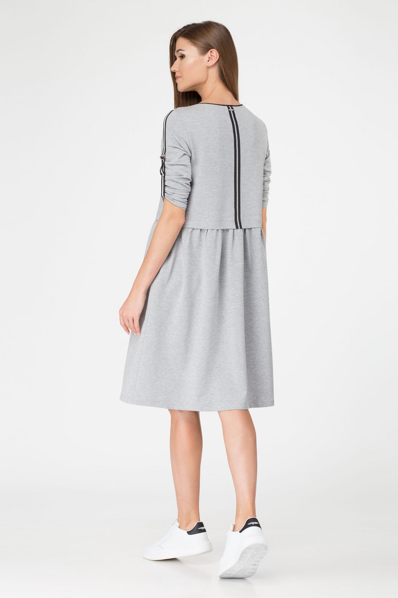 Стильное молодежное платье в спортивном стиле из хлопкового трикотажного полотна с модными лампасами. Платье отрезное по талии, длиной ниже коленей, с рукавами длиной три четверти. Рукава с патами, которые регулируют длину. Нижняя часть платья расширенная, с небольшой сборкой по талии.В боковых швах имеются карманы. Платье дополнено печатью по переду и по спинке.