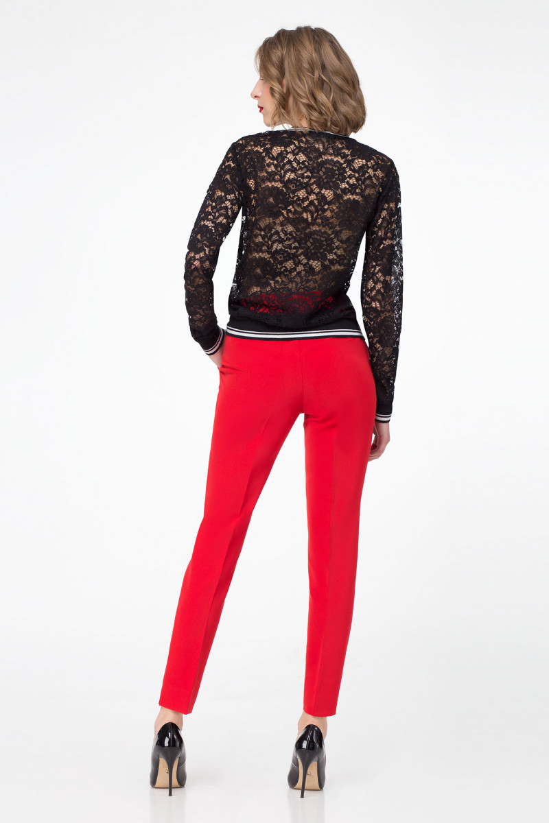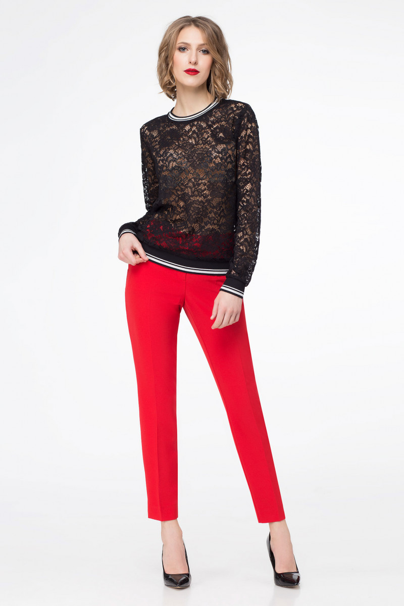 Стильная молодежная блузка из кружевной ткани. Блузка полуприлегающего силуэта, с длинными рукавами, с круглым вырезом горловины. Низ рукавов, низ изделия и горловина обработаны декоративным довязом. Такая блузка отлично подойдет и как на вечеринку, создавая сексуальный образ, так и в офис, если блузку сочетать с телесным топом или белой блузкой.