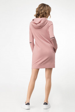 Платье в спортивном стиле из трикотажной хлопковой ткани. Платье полуприлегающего силуэта, с длинными рукавами, с высоким воротником переходящим в капюшон. В боковых швах платья имеются карманы. Низ рукавов и низ платья обработан притачной планкой. По горловине и по рукавам имеются декоративные металлические молнии.