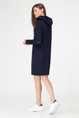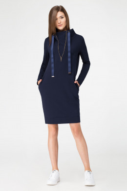 Платье в спортивном стиле из трикотажной хлопковой ткани. Платье полуприлегающего силуэта, с длинными рукавами, с высоким воротником переходящим в капюшон. В боковых швах платья имеются карманы. Низ рукавов и низ платья обработан притачной планкой. По горловине и по рукавам имеются декоративные металлические молнии.