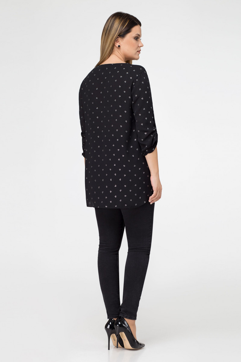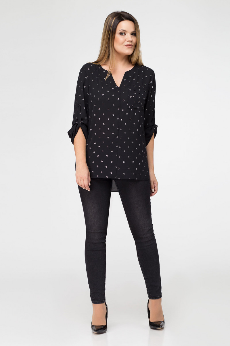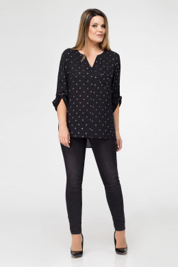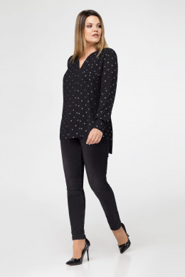 Элегантная блузка из шифоновой ткани с интересным "серебристым геометрическим рисунком" , придает образу шарм и легкость. Блузка свободного силуэта, с V- образным вырезом горловины, с нагрудными вытачками. на дедалях переда слева расположен нагрудный карман и декорирован бусинками. Спинка лаконичная. Хороший вариант для офиса, прогулки.