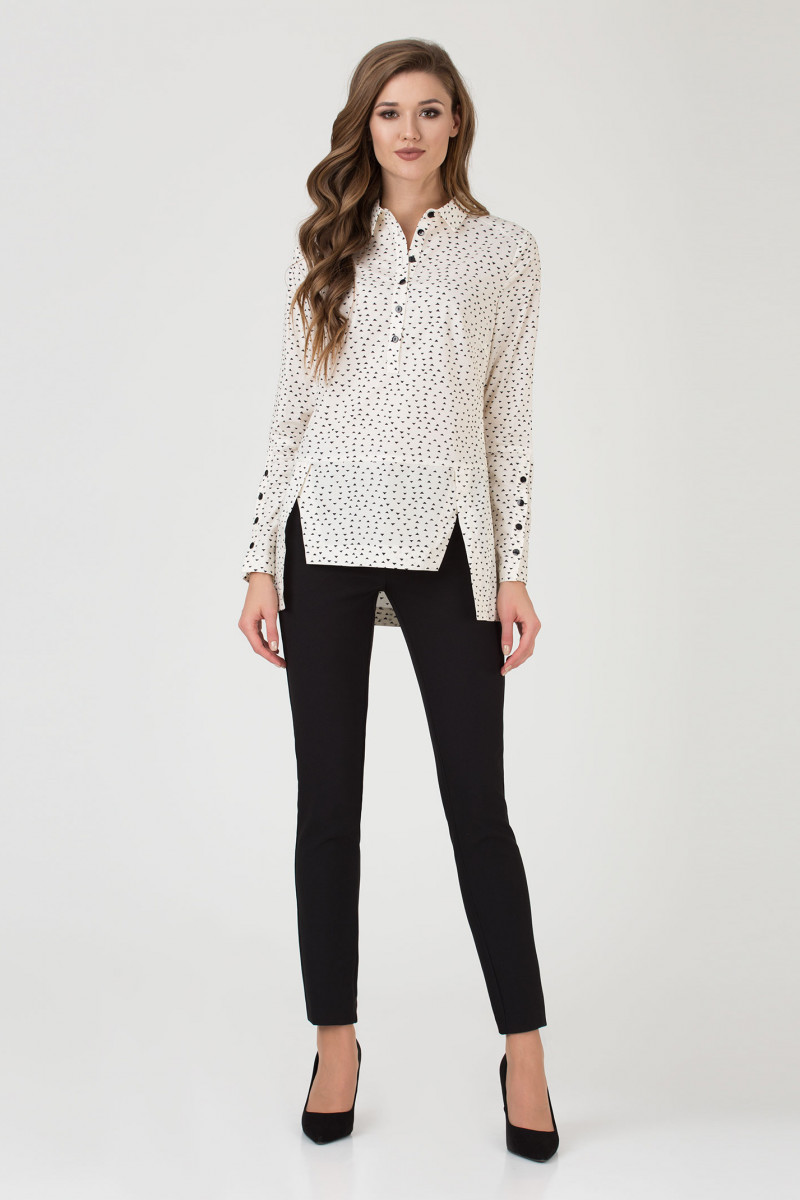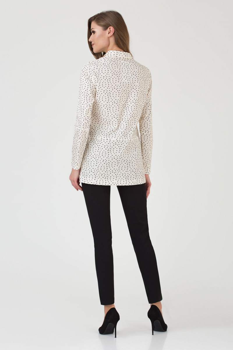 Стильная блузка из хлопковой ткани в рисунок треугольники. Блузка прямого силуэта, с кокетками, с нагрудными вытачками, с центральной планкой на петли пуговицы, воротник отложной со стойкой, с отрезной деталью ниже линии талии, линия низа фигурной формы. Спинка дленее переда. Рукава втачные длинные. Хороший вариант как для офиса, так и для выхода в свет.