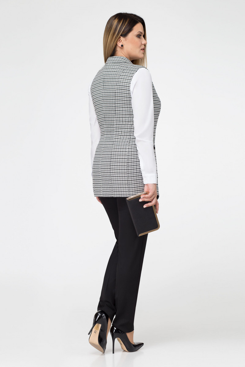 Стильный, элегантный жилет, из вискозной ткани с рисунком "в гусиную лапку". Жилет полуприлегающего силуэта, с воротником пиджачного типа, с ассиметричной застежкой. На жилете выполнены рельефы, обеспечивающие отличную посадку по фигуре. По переду горизонтально расположены карманы. Изюминкой является пояс по линии талии ассиметричный, его можно завязать узлом и на бант. Нет никаких сомнений в том, что обладательница этого жилета, будет выглядеть безупречно.