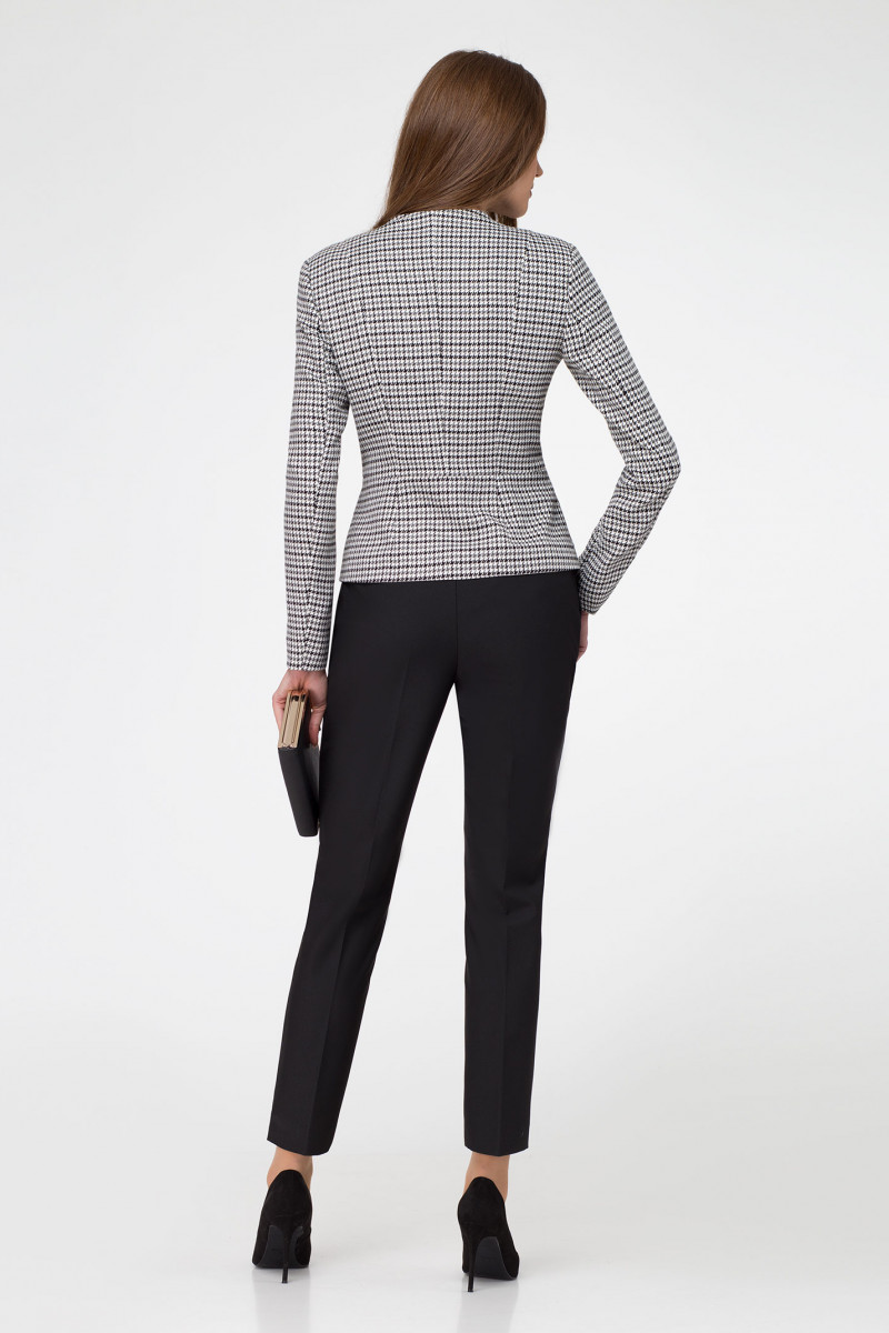 Стильный, элегантный жакет, из вискозной ткани с рисунком "в гусиную лапку". Жакет полуприлегающего силуэта, с центральной застежкой на одну петлю пуговицу,с отрезной баской по линии талии. На жакете выполнены рельефы, обеспечивающие отличную посадку по фигуре. Шикарный образ этого комплекта, как по случаю так и без него.
