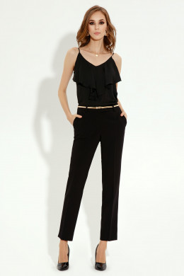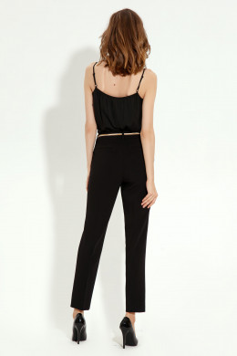 Брюки женские, зауженные к низу, дополнены карманами в боковых швах и их имитацией в задней части изделия. По бокам штанин - небольшие разрезы. Брюки женские зауженные застегиваются на молнию. На поясе располагается потайной крючок-застежка и шлевки для ремня.
