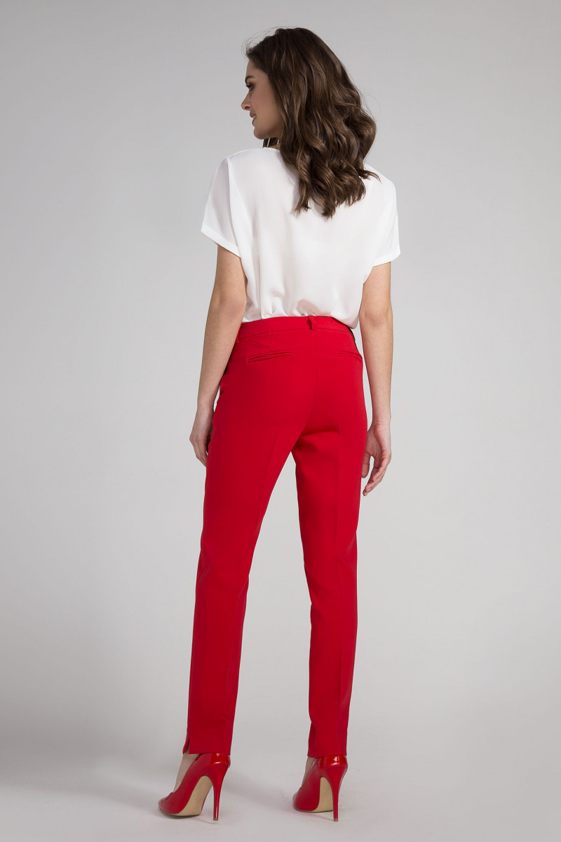 Брюки женские, зауженные к низу, дополнены карманами в боковых швах и их имитацией в задней части изделия. По бокам штанин - небольшие разрезы. Брюки женские зауженные застегиваются на молнию. На поясе располагается потайной крючок-застежка и шлевки для ремня.