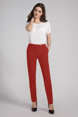Брюки женские, зауженные к низу, дополнены карманами в боковых швах и их имитацией в задней части изделия. По бокам штанин - небольшие разрезы. Брюки женские зауженные застегиваются на молнию. На поясе располагается потайной крючок-застежка и шлевки для ремня.