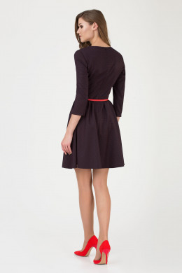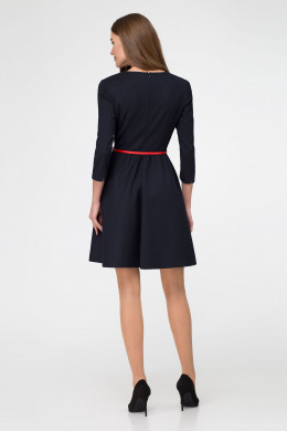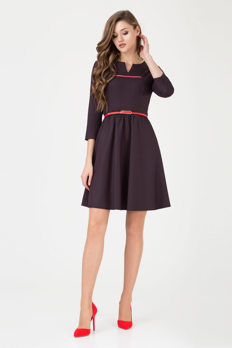 Молодёжное,романтичное,очень женственное платье актуального X-образного силуэта порадует стильную девушку и украсит её будни. Мягкая ткань из вискозы с эластаном приятно удивит своими свойствами.Лиф прилегающёго силуэта декорирован красной молнией в горизонтальном резе .Горловина круглая с разрезом по центру.Рукав втачной,2-хшовный с разрезом по низу.По переду и спинке лифа выполнены вытачки.юбка отрезная по линии талии расклешена книзу и присборена на талии.Также изящность талии подчёркивает тонкия красный пояс. Длина платья -выше колена.