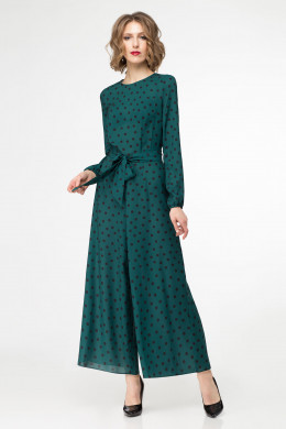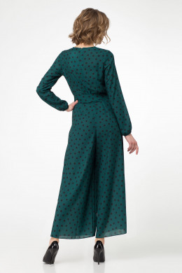 Стильный модный комбинезон с широкими штанами, имитирующий платье. Комбинезон выполнен из плотного шифона с рисунком в горохи. Комбинезон отрезной по талии, с круглым вырезом горловины, с длинными рукавами. Застежка на потайную тесьму-молнию по спинки. По переду втачен пояс, который подчеркивает талию. Отличный вариант для светских мероприятий.