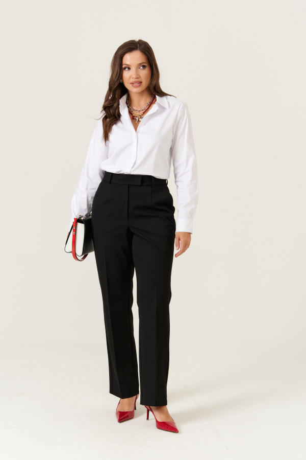 Женские брюки с высокой посадкой, поясом и наклонными карманами в боковом шве. Идеально ровные стрелки визуально удлиняют ноги. Брюки женские просты в уходе и удобны в носке. Плотная ткань хорошо держит форму, не теряет яркость после стирки.