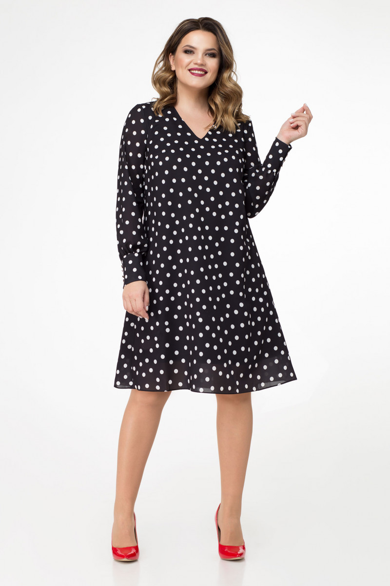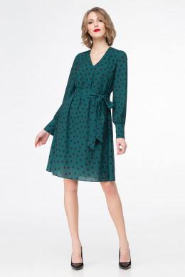 Нарядное платье чуть расширенного силуэта со съёмным поясом из основной ткани. Платье выполнено из плотной шифоновой ткани с рисунком в горошек. Платье с V-образным вырезом горловины с длинными рукавами. Рукава по низу на широкой притачной манжете с декоративными петлями и пуговицами. Беспроигрышный вариант для любого светского мероприятия.