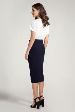 Классическая юбка из поливискозной ткани длиной ниже коленей. Юбка полуприлегающего силуэта, с застежкой на потайную молнию на заднем полотнище юбки. Юбка дополнена съёмным поясом из основной ткани на металлических кольцах. Строгий, лаконичный вариант для офиса.
