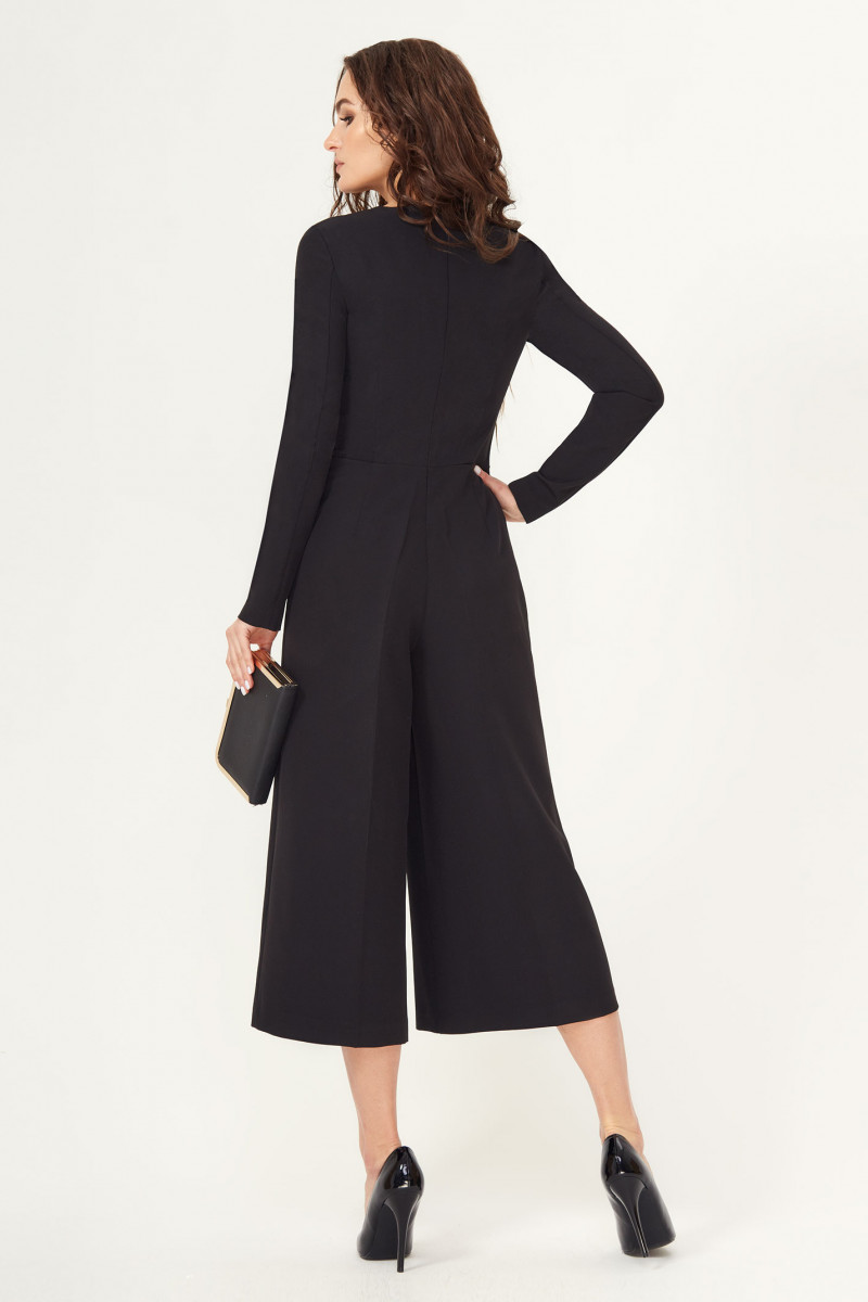 Модный комбинезон из плательной струящейся ткани с укороченными модными брючинами. Комбинезон полуприлегающего силуэта, с длинными рукавами, с глубоким V-образным вырезом горловины, с застежкой на потайную тесьму-молнию по спинке. Комбинезон дополнен изящной большой пуговицей по переду. Комбинезон создан для уверенной в себе девушки, которая знает, как выглядеть стильно, модно и неотразимо.