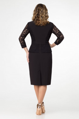Нарядное платье выполнено из мягкой эластичной ткани в сочетании с кружевом. Платье полуприлегающего силуэта, отрезное по талии, с рукавами из кружева длиной три четверти. Платье с V-образным вырезом горловины с имитацией двубортной застежки по переду. Застежка платья расположена на спинке на потайную молнию. Платье имеет баску, которая создает имитацию жакета с юбкой.