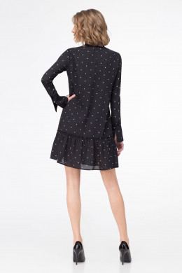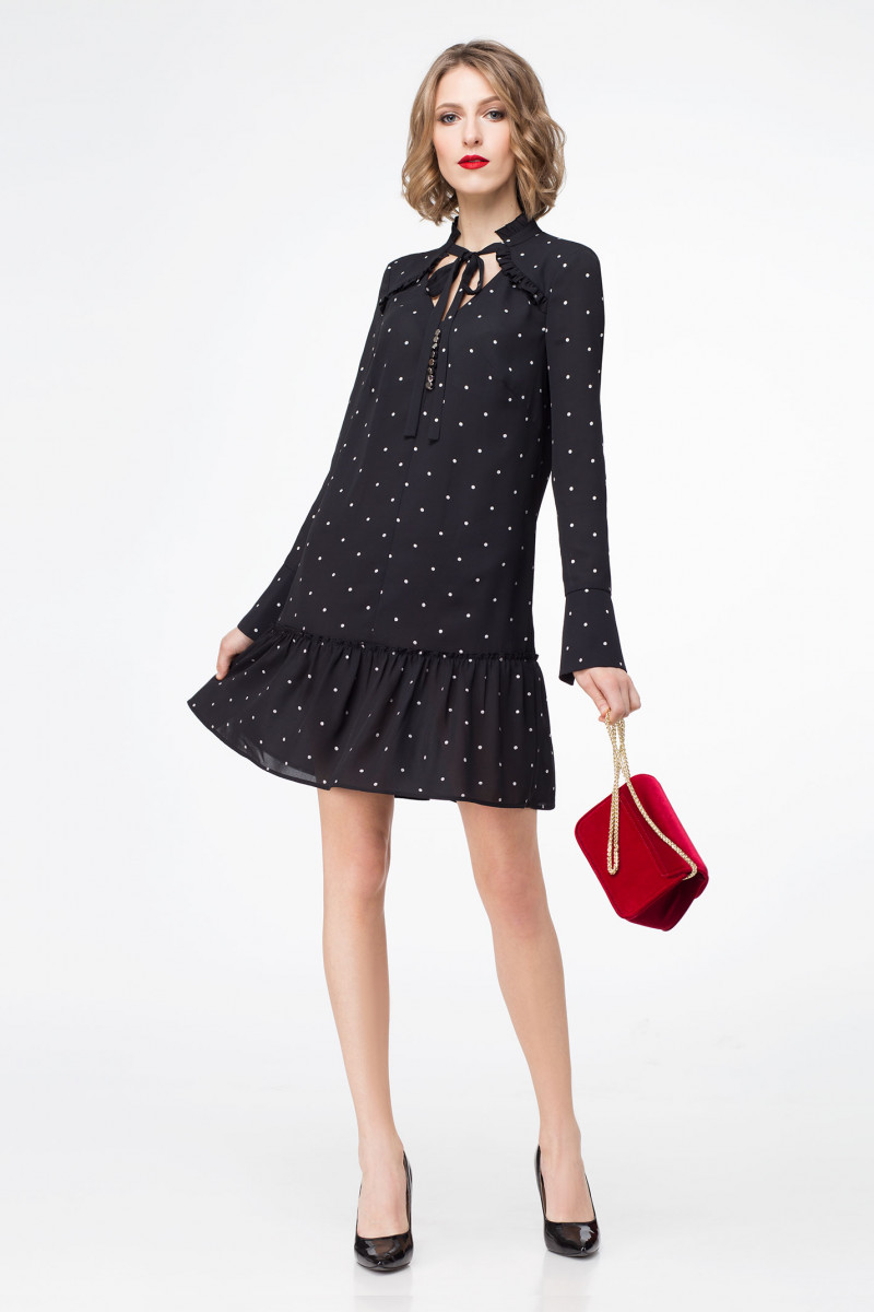 Маленькое черное платье говорит само за себя. Платье из шифона, рисунок в романтический серебристый горошек. Свободного силуэта, горловина фигорной формы, воротник- стойка с рюшей, по центру от горловины навесные петли и пуговицы. По переду кокетки в шов вставлена рюша, по низу изделия волан. Рукава длинные, с манжетой на одну пуговицу. Разнообразить лук помогут яркие аксессуары.