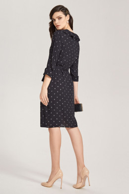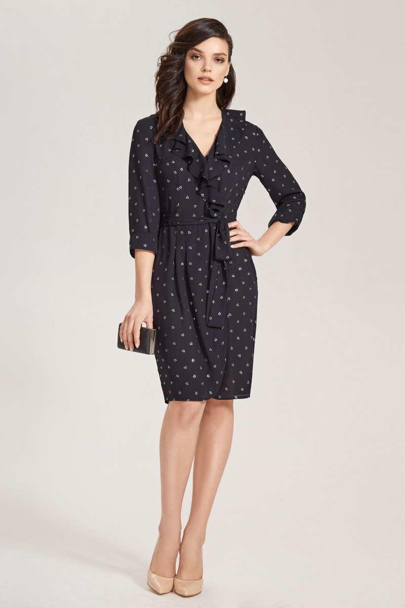 Эленгантное платье из шифона, рисунок в романтический серебристый треугольник. Платье прилегающего силуэта, отрезное по линии талии, в боковом шве молния, с V-образным вырезом и воланом по переду, с рельефными швами, от линии талии до низа асимметричный запах, по линии талии пояс из основной ткани. Спинка с талиевыми вытачками. Рукава 3/4 с притачными манжетами. Отличный вариант для выхода в свет и для будней.