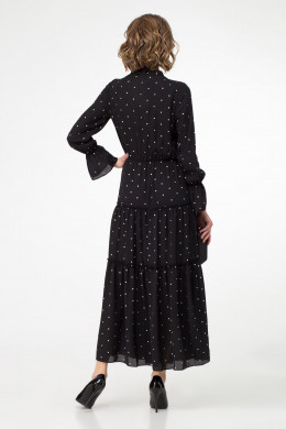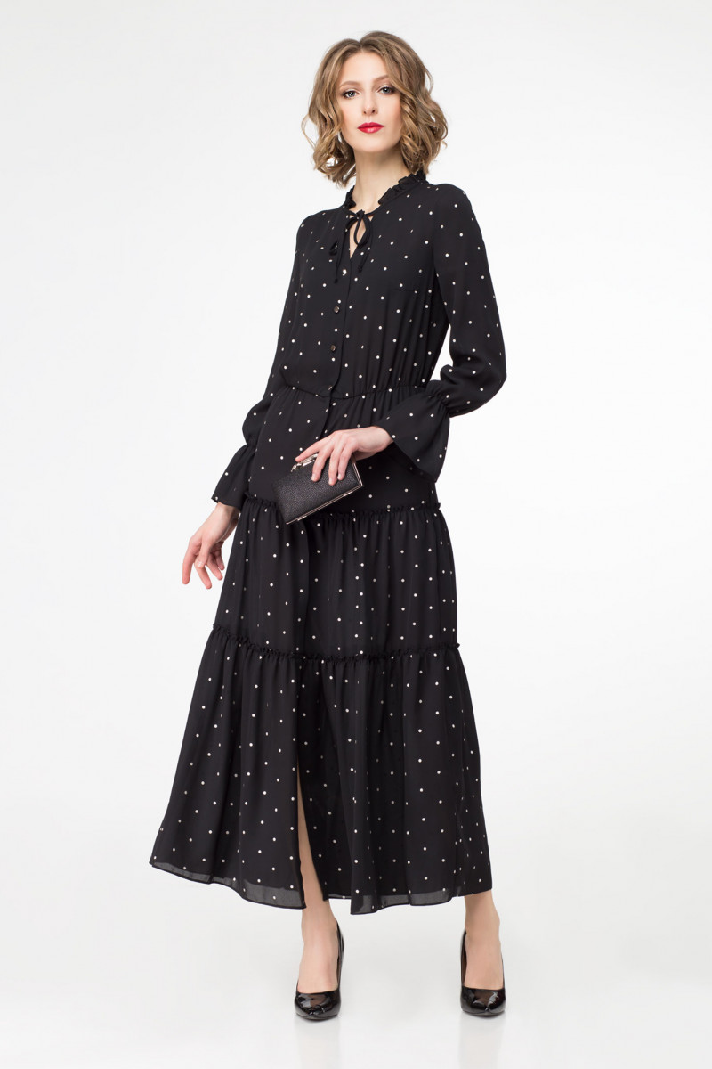 Шикарное длнное платье в пол из шифона, рисунок в романтический серебристый горошек. Горловина фигурной формы, декорирована рюшей. Платье отрезное по линии талии, со сборкой на резинку, центральная застежка до линии талии на петли пуговицы, от талии до линии низа потайная застежка на петли пуговицы. Юбка с горизонтальными подрезами, декорирована рюшей. Тренд "девушка в черном" стал частью такого понятия как сексуальность, величественность и грациозность. В этом платье девушка превратится в настоящую леди.