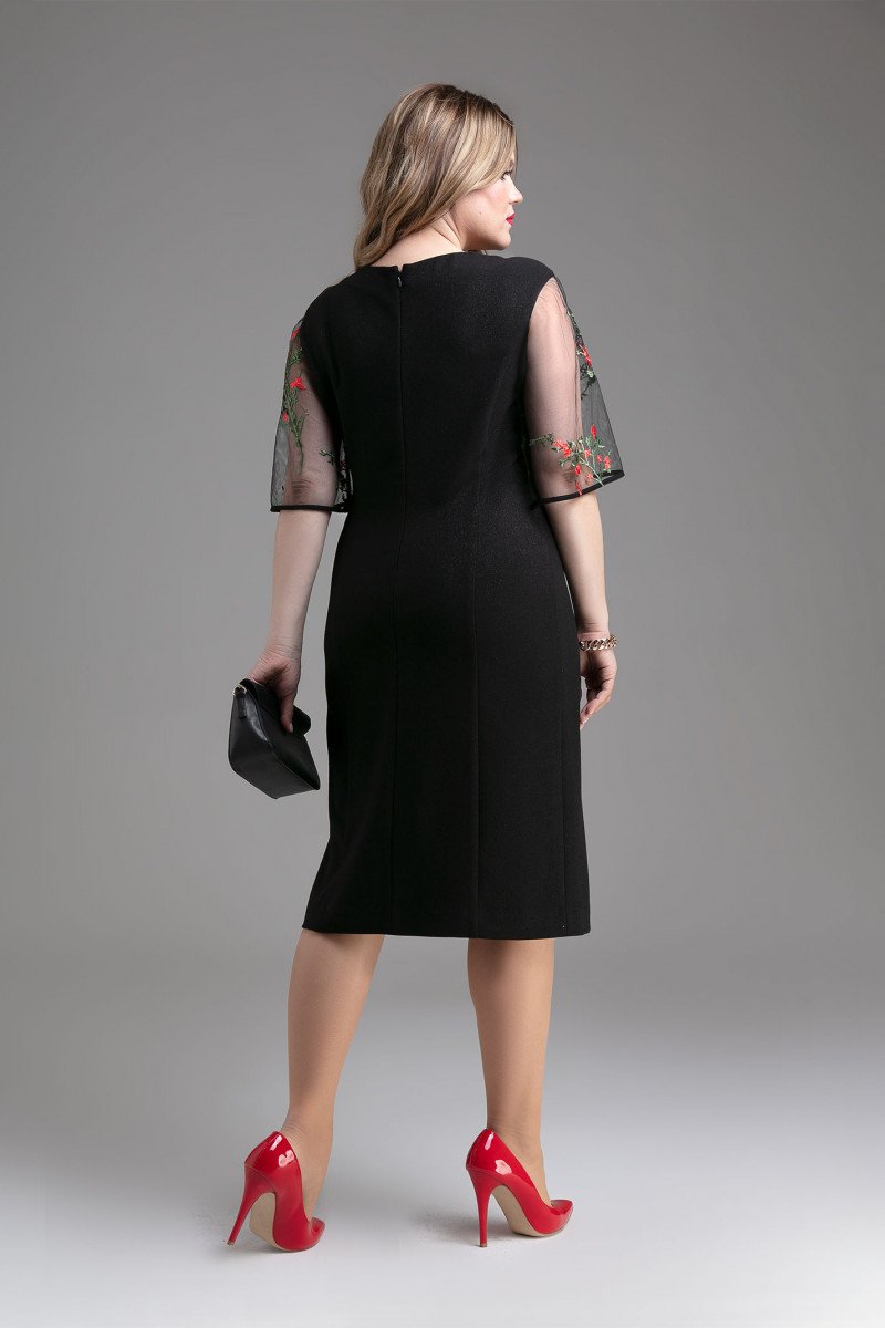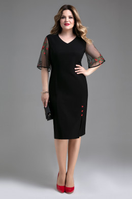 Нарядное элегантное платье из мягкой эластичной ткани с лёгким блеском прекрасно подчёркивает фигуру и стройнит за счёт длины за колено, V-образного выреза и разреза от низа платья.Свободного кроя рукава выполнены из чёрной сеточки с изысканной вышивкой. Разрез декорирован маленькими пришивными пластиковыми бантиками. Платье сзади застёгивается на потайную молнию. Чудесный вариант платья для торжественного случая,которое также может легко создать элегантный образ на каждый день.