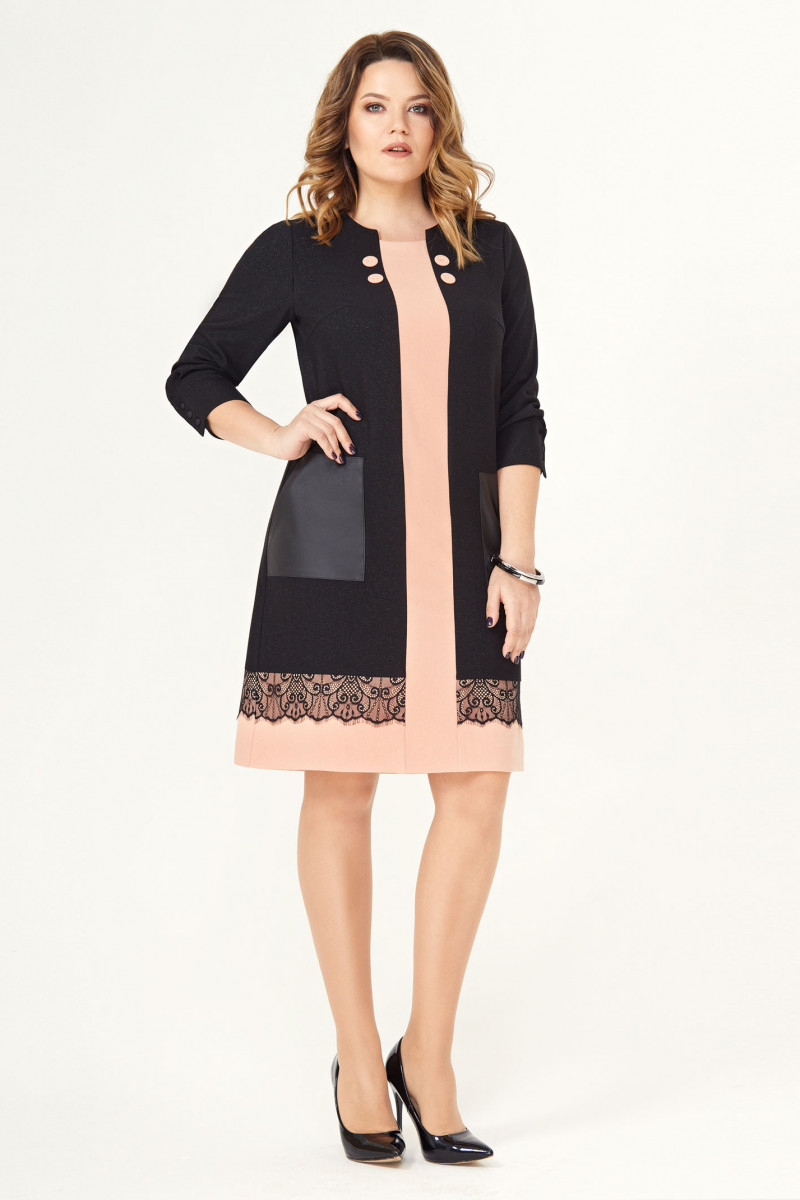 Стильное платье трапецевидного силуэта из мягкой,пластичной,немнущейся ткани,которое сочетает в себе два цвета и декорировано французским кружевом и пуговицами.Вырез горловины фигурной формы.Длина рукава7/8. По низу рукава выполнен манжет,который застёгивается на 3 петли-пуговицы.На передней части платья выполнены накладные карманы. Платье будет прекрасным выбором на каждый день для энергичной и стильной женщины.Чудесное платье, в котором удачно объединены нежный пудровый и солидный чёрный. В платье предусмотрены накладные карманы спереди. Подол украшен очаровательный французским кружевом.