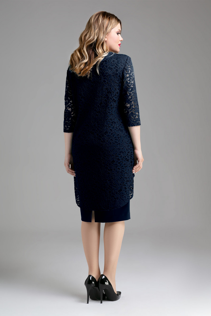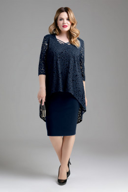 Нарядное платье из однотона и кружева с имитацией блузки. Нижний слой платья -футляр, с талиевыми и нагрудными вытачками, в боковом шве молния, верхняя деталь из кружева, разведенная с перепадом длины, спинка длиннее переда, круглый вырез горловины, с декоративными шлевками и двумя пришивными стразами. Спинка с каплевидным разрезом от горловины на одну пуговицу. Вы уже - идеал для подражания.