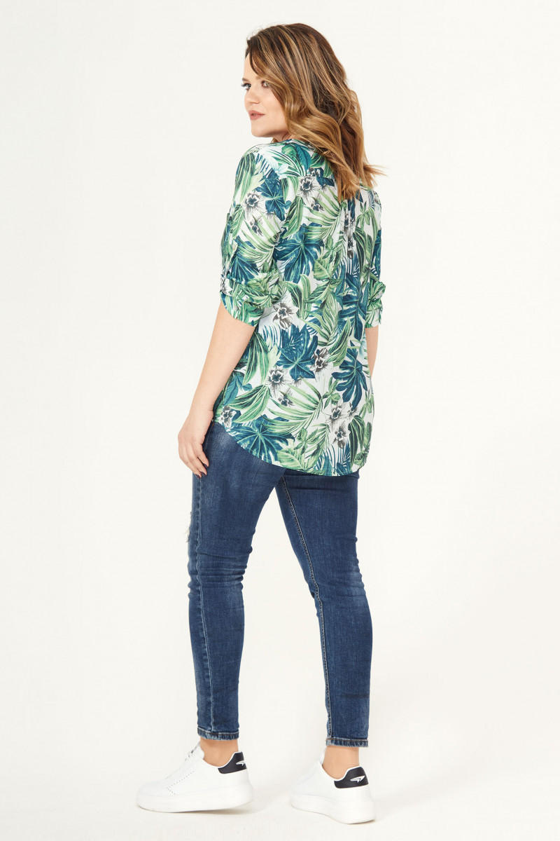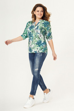 Легкая летняя блузка из вискозной ткани с ярким рисунком. Блузка с фигурным вырезом горловины, с застежкой на планку, с удлиненной спинкой. Передняя часть блузки с верхним накладным карманом. По переду вытачки, на спинке кокетка и небольшая сборка от кокетки, которая обеспечивает комфорт. Рукава с притачными манжетами, застегивающимися на петлю и пуговицу. По рукаву имеется пата, с помощью, которой можно регулировать длину рукава. Отличный вариант для жарких летних дней.