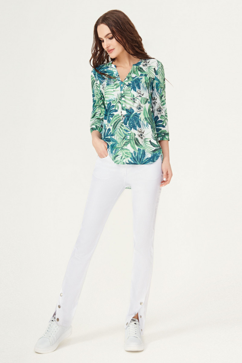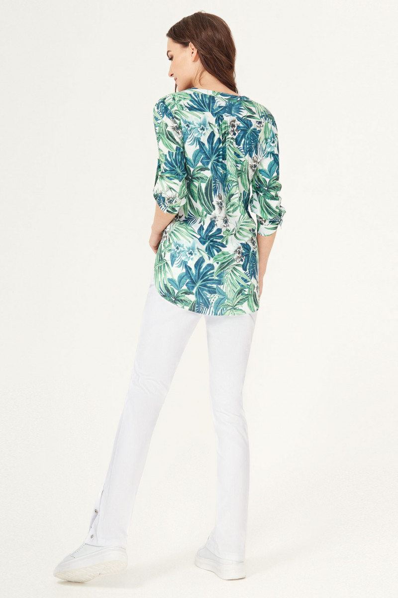 Легкая летняя блузка из вискозной ткани с цветочным рисунком. Блузка с фигурным вырезом горловины, с застежкой на планку, с удлиненной спинкой. Передняя часть блузки с двумя верхними накладными карманами. По переду вытачки, на спинке кокетка. Рукава с притачными манжетами, застегивающимися на петлю и пуговицу. По рукаву имеется пата, с помощью, которой можно регулировать длину рукава. Отличный вариант для жаркого лета.