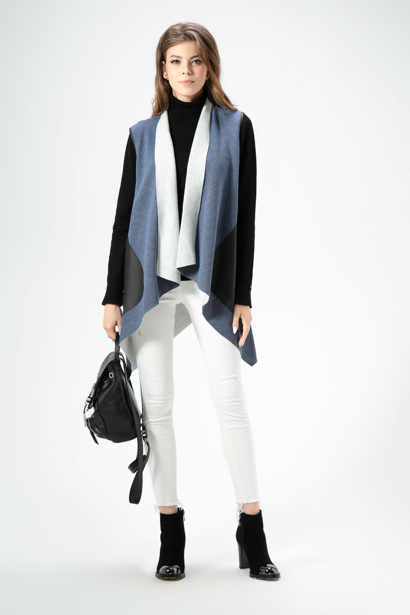 Жилет из тёплого, хлопкого, двухстороннего мягкого трикотажа окажется незаменимой деталью гардероба этой весной.Максимально простой крой и функциональность порадуют его обладательницу и помогут завершить стильный образ.Неровная линия низа изделия визуально вытягивает фигуру,придаёт шарм.Отложной цельнокроеный воротник,карманы лаконичной формы и окантовки пройм из чёрной искусственной кожи делают изделие практичным и изысканным одновременно.