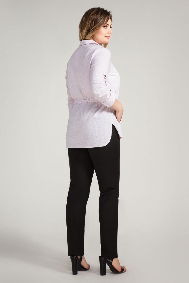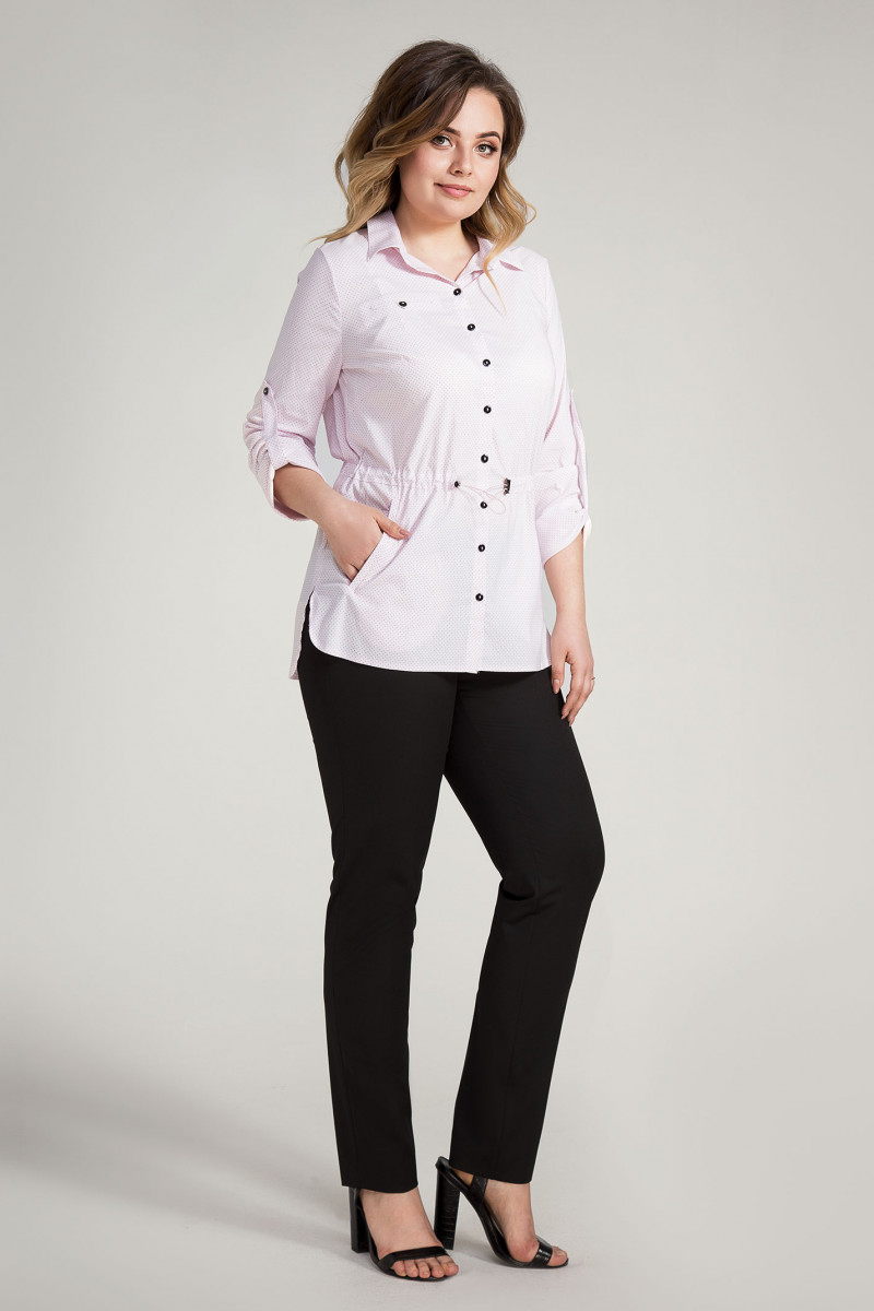 Стильная блузка из хлопковой ткани, рисунок в мелкий горох. Детали переда с нагрудными вытачками, с центральной застежкой на петли пуговицы, по линии талии кулиса, по бокам два кармана с листочками, сверху декоративный карман в рамку. Спинка с плечевыми вытачками ,с кулисой по линии талии, линия низа с перепадом длины. Рукава удлиненные. Отличный вариант под кроссовки и каблуки.