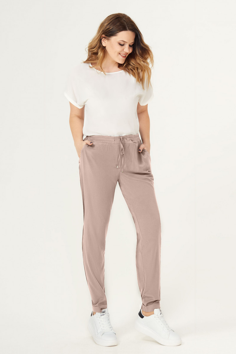 Брюки свободные на резинке с декоративными шнурками по переду. Брюки из вискозной ткани. Снизу брюки чуть заужены, на манжете. По бокам карманы, сзади имитация карманов. Отличный вариант для жарких летних дней.