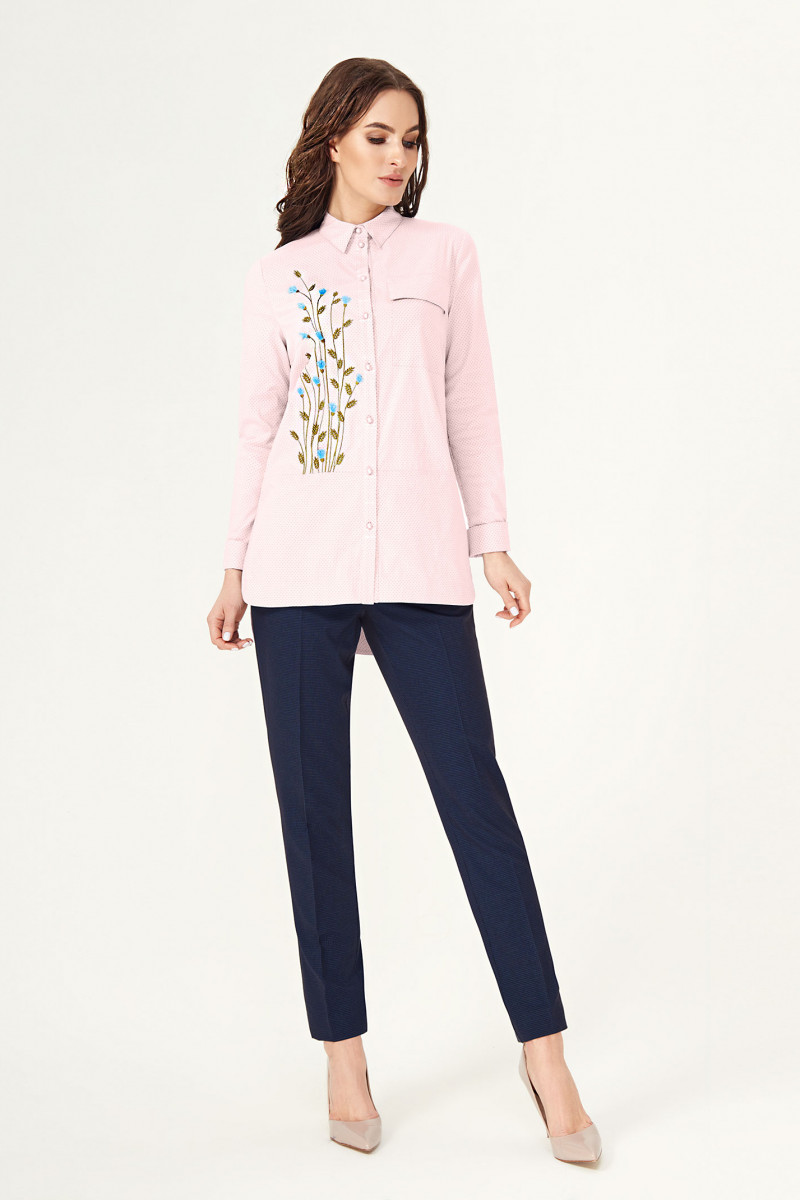 Универсальная рубашка идеально сочетается не только с дресс-кодом, но и подходит к классическим джинсам. Особый шарм рубашке придаёт свежая вышивка в виде василька. Блузка прямого силуэта, с центральной застежкой на петли пуговицы, по переду отрезная баска, на левой детали вышивка, на правой накладной карман с клапаном. Спинка лаконичная.
