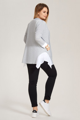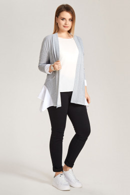 Чудесный трикотажный кардиган на каждый день выполнен из мягкого трикотажного полотна и наверняка будет радовать его одладательницу каждый день. Пластичный трикотаж дарит ощущение комфорта и свободы действий,хлопковый изнутри кардиган приятен на ощупь и при этом имеет лёгкий мерцающий блеск, благодаря тончайшей нити люрекса,присутствующей в переплетении на лицевой стороне полотна. Кардиган удачно сочетает в себе две ткани .Белый шифон образует ниспадающие мягкие фалды по бокам изделия,что невероятно стройнит фигуру.Также подчеркнуть остроту образа и освежить его помогают присборенные шифоновые манжены на рукавах.Линия плеча кардигана приспущена.Шалевый воротник мягко облегает шею сзади и драпируется спереди.Также по переду выполнены карманы фигурной формы,декорированые изящными стеклостразами.Кардиган чудесно будет смотреться с тонким белым джемпером,блузкой без рукавов или майкой с принтом.Идеалиный вариант одежды на каждый день для стильной деловой женщины.