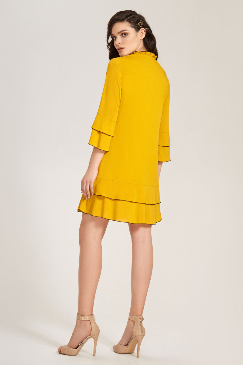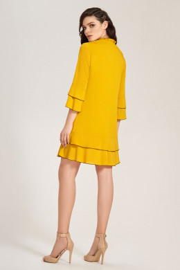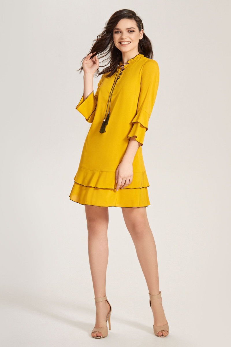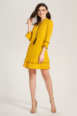 Романтическое платье из вискозной ткани. Платье прямого силуэта, с воланами по линии низа, придают образу воздушность и романтизм, горловина со стойкой и рюшей от нее, с планками и декоративным шнуром и кисточками. Спинка прямая с воланами по линии низа. Рукава втачные с воланами 3/4. Образ создан для молодых девушек, которые будут выглядеть неотразимо, которые умеют совмещать работу и отдых.