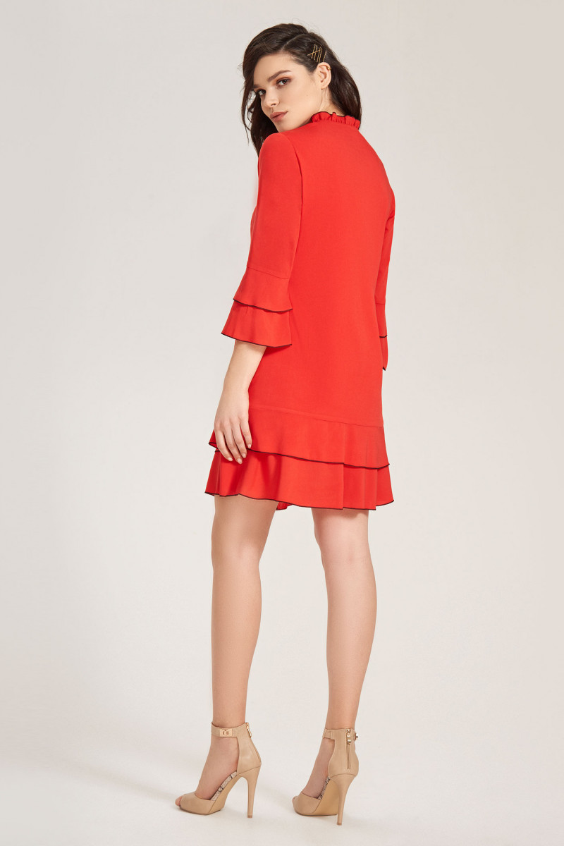 Романтическое платье из вискозной ткани. Платье прямого силуэта, с воланами по линии низа, придают образу воздушность и романтизм, горловина со стойкой и рюшей от нее, с планками и декоративным шнуром и кисточками. Спинка прямая с воланами по линии низа. Рукава втачные с воланами 3/4. Образ создан для молодых девушек, которые будут выглядеть неотразимо, которые умеют совмещать работу и отдых.