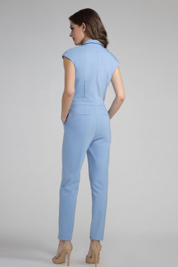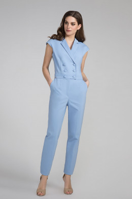 Элегантный нарядный комбинезон из хлопковой ткани. Комбинезон создан для уверенной в себе девушке, которая стремится выглядеть эффектно и произвести особое впечатления на окружающих. Комбинезон идеально подойдет для деловых встреч или светских мероприятий, ведь вся строгость и геометричность линей придает особый шик даной модели. Комбинезон полуприлегающего силуэта, с V-образным вырезом горловины, с утончёнными лацканами и воротником, с двубортной застежкой на петли и пуговицы, отрезной по талии. По бокам карманы. Брюки комбинезона заужены книзу, по бокам разрезы.