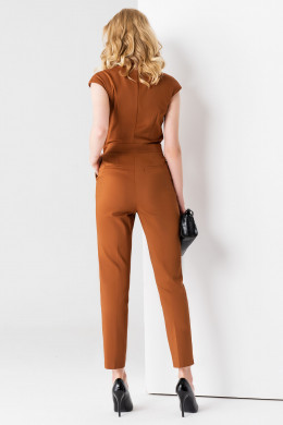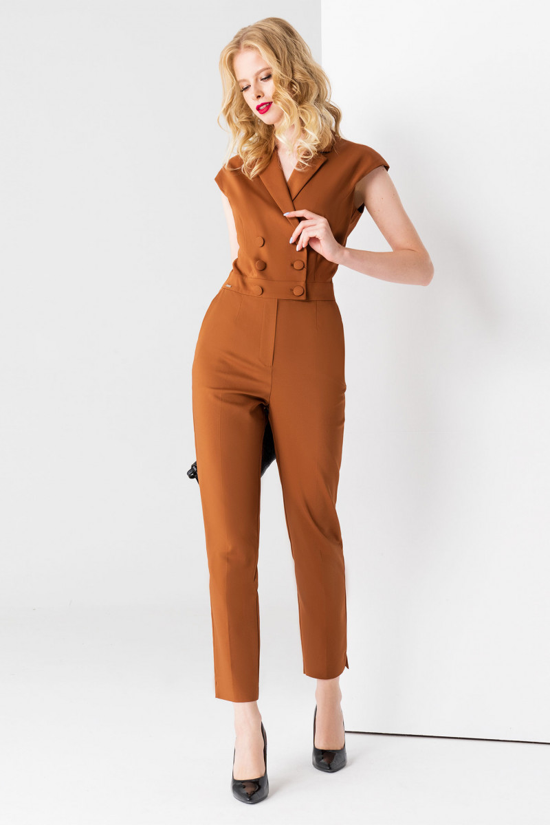 Элегантный нарядный комбинезон из хлопковой ткани. Комбинезон создан для уверенной в себе девушке, которая стремится выглядеть эффектно и произвести особое впечатления на окружающих. Комбинезон идеально подойдет для деловых встреч или светских мероприятий, ведь вся строгость и геометричность линей придает особый шик даной модели. Комбинезон полуприлегающего силуэта, с V-образным вырезом горловины, с утончёнными лацканами и воротником, с двубортной застежкой на петли и пуговицы, отрезной по талии. По бокам карманы. Брюки комбинезона заужены книзу, по бокам разрезы.