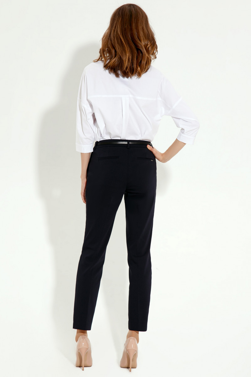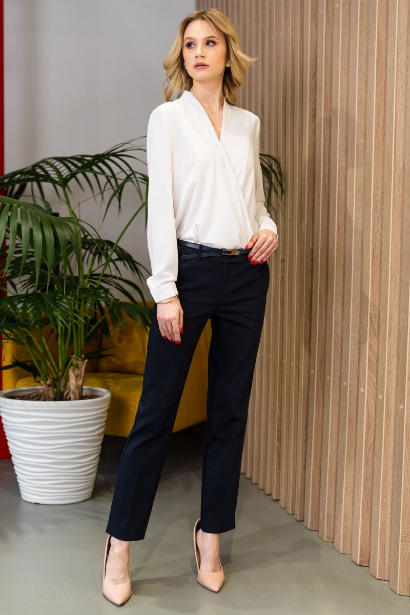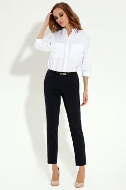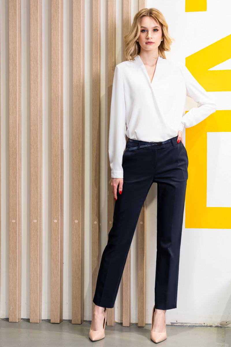Классические укороченные зауженные книзу брюки из хлопковой ткани. По переду по бокам имеются карманы. На задних частях брюк имитация карманов в рамку. Застежка на тесьму-молнию и потайной крючок на поясе. По поясу имеются шлевки, для съёмного пояса. Такие брюки отлично сочетаются с различными жакетами и джемперами. Беспроигрышный вариант в гардеробе каждой женщины.