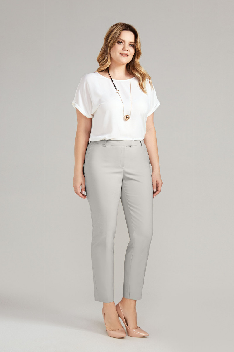 Классические укороченные зауженные книзу брюки из хлопковой ткани. По переду по бокам имитация карманы. На задних частях брюк имитация карманов в рамку. Застежка на тесьму-молнию и потайной крючок на поясе. По поясу имеются шлевки, для съёмного пояса. Такие брюки отлично сочетаются с различными жакетами и джемперами. Беспроигрышный вариант в гардеробе каждой женщины.