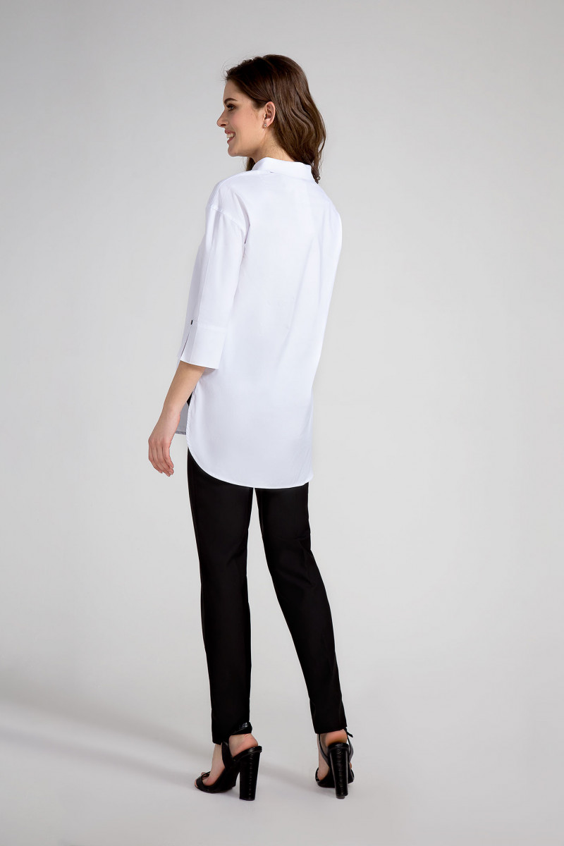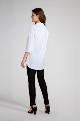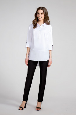 Аккуратные линии кроя, простые решение модели в минималистичном стиле - и вы выглядите лаконично и стильно. Блузка прямого силуэта со спущенным плечом, с планкой на петли пуговицы. Блузка с перепадом длины , перед короче спинка длинее. Рукава втачные 3/4, с притачными манжетами.