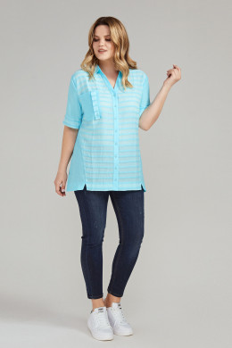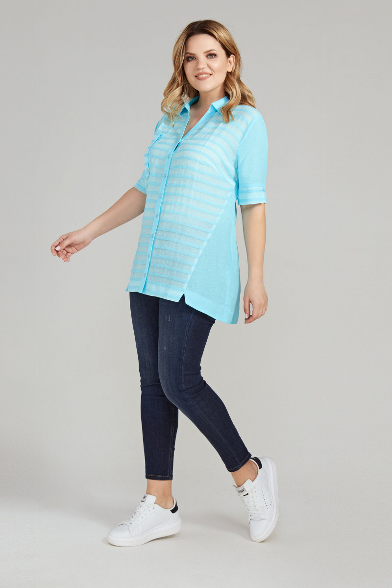 Блузка полуприлегающего силуэта, из хлопковой и вискозной ткани, комбинируется с однотоном и полоской, делая ее интересной. Блузка с центральной застежкой на петли пуговицы, с рельефными швами и нагрудными вытачками, с накладным карманом и декоративной патой, блузка с перепадом длины, перед короче, спинка длиннее. Спинка с кокеткой и сборкой от нее. Рукава втачные с притачной манжетой, длина до линии локтя. Блузка- это тренд на все время, она относится к базовой части гардероба. С помощю блузки можно создавать интересные образы на каждый день, можно носить самостоятельно, а также комбинировать с кардиганами и жакетами.