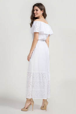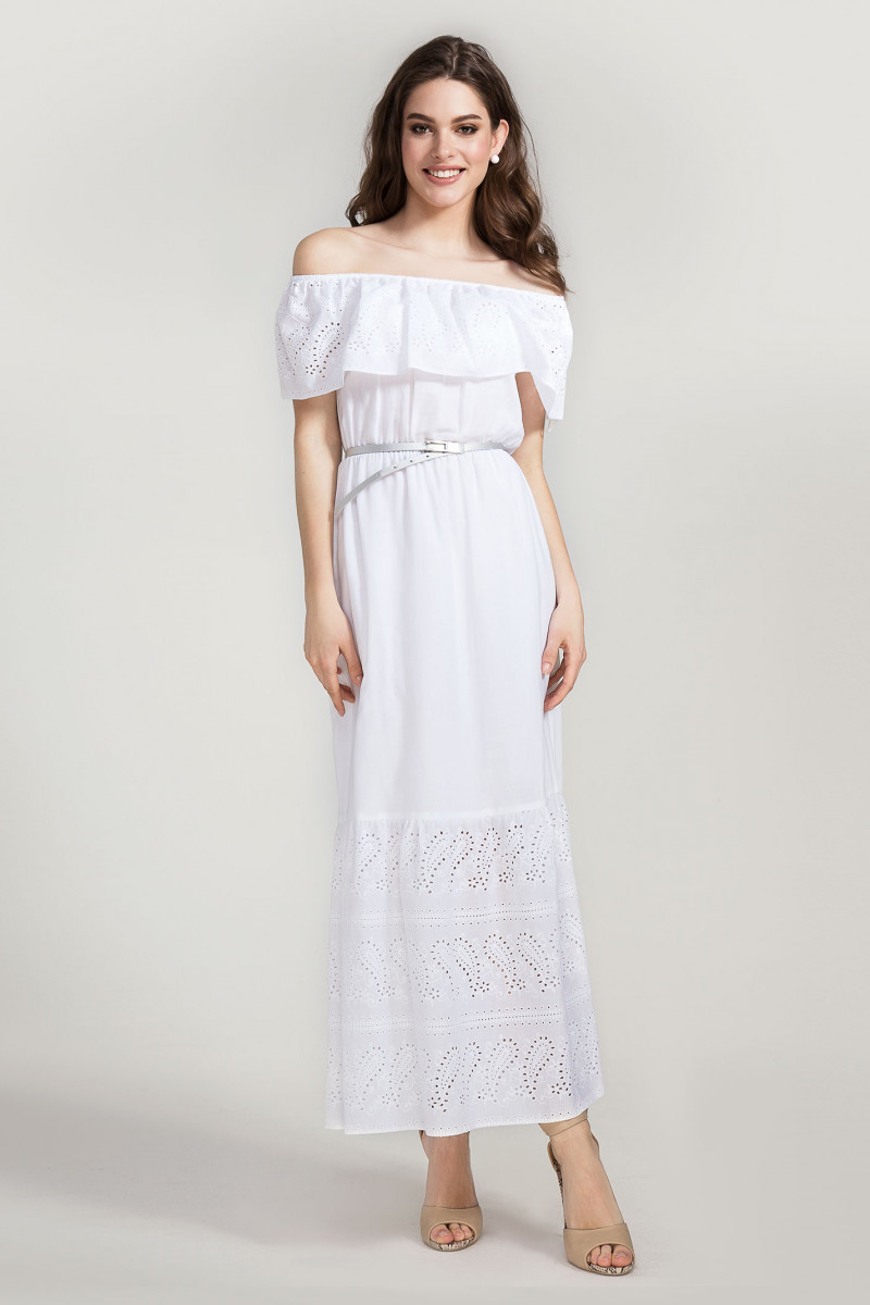 Легкое, романтичное, летнее платье, из хлопка. Платье длинное, по линии талии резинка, по горловине притачной волан из хлопкового кружева, и на юбке притачвается хлопковое кружево. В комплект платья входит пояс. Отличный вариант для выхода в свет и на отдых.