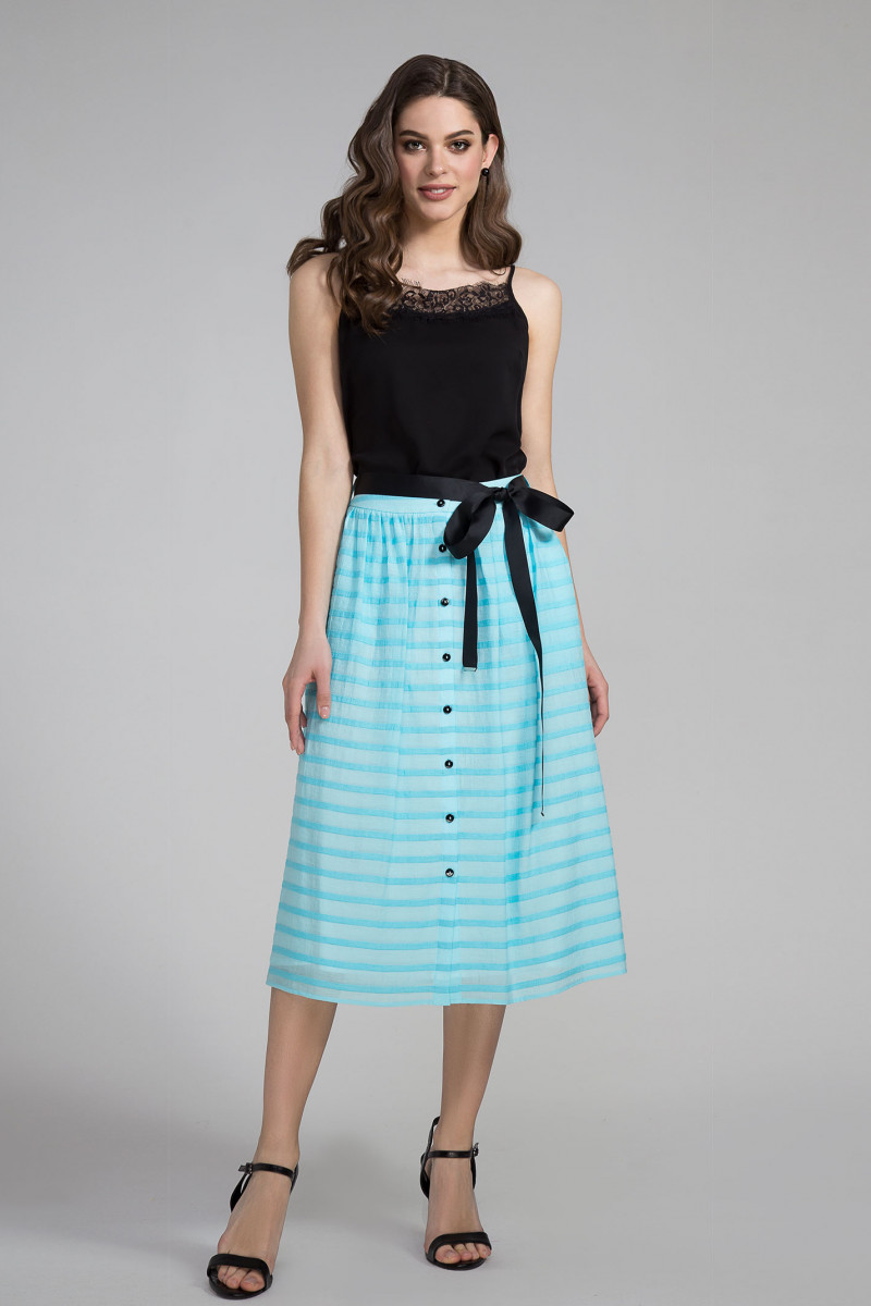 В этой юбке сделан акцент на романтизм, легкость ткани делает образ воздушным и загадочным. Юбка расширенная книзу, длинна ниже коленей, пояс притачной, с планкой по переду и пуговицам, в боковых швах карманы, декоративный атласный пояс с металлическими наконечниками. Шикарный образ, как по случаю так и без.