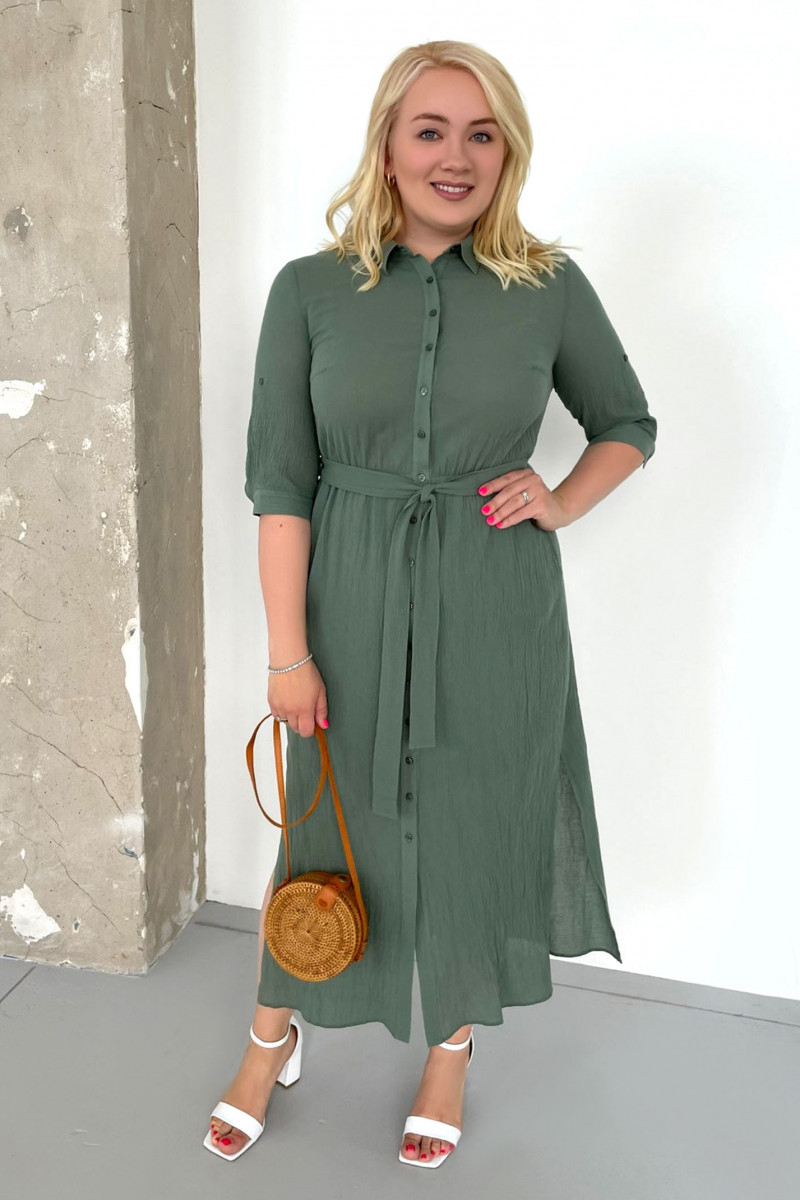 Легкое летнее платье из тонкой хлопковой ткани. Платье прямого силуэта, со съёмным поясом из основной ткани. В боковых швах карманы. Платье с центральной сквозной застежкой на петли и пуговицы. Нижняя часть платья на хлопковой подкладки. По бокам имеются разрезы. Отличный вариант для жарких летних дней.